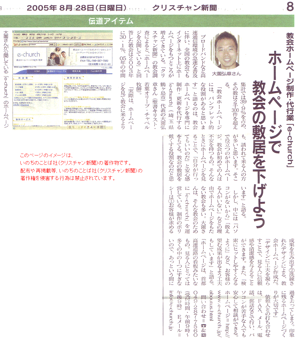 「教会ホームページを作成したいが、何をどうやったらいいのか分からない。」 「作ってみたが、期待した成果が出ない。」 等のお客様のニーズに確実に応えます。イーチャーチ代表大薗は、聖書を誤りなき神の言葉と信じる開拓教会牧師でもあり、伝道学的立場からも理にかなったご提案をさせていただいております。